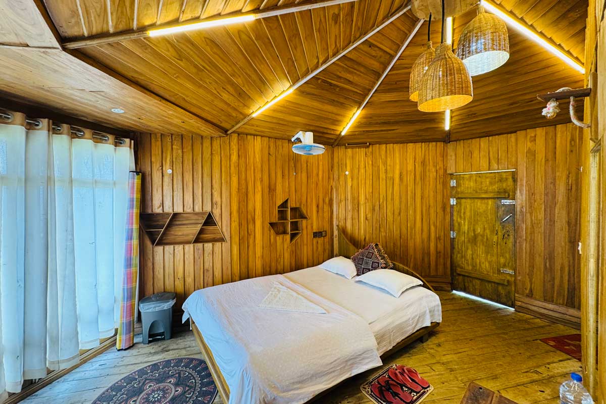 Meghla cottage comprises 1 couple Bed, 1 Bedside Table, 1 stand fan, 1 infinity love shaped balcony. The room is furnished with an almirah and 1 large mirror. Our modern-fittings spacious bathroom is equipped with standard toiletries as well as all the amenities. A Complimentary Bottle of water, Breakfast, Morning tea, and access to the largest garden area are provided during your stay. You will get a full infinity hill view of Mizoram from inside and outside the cottage.